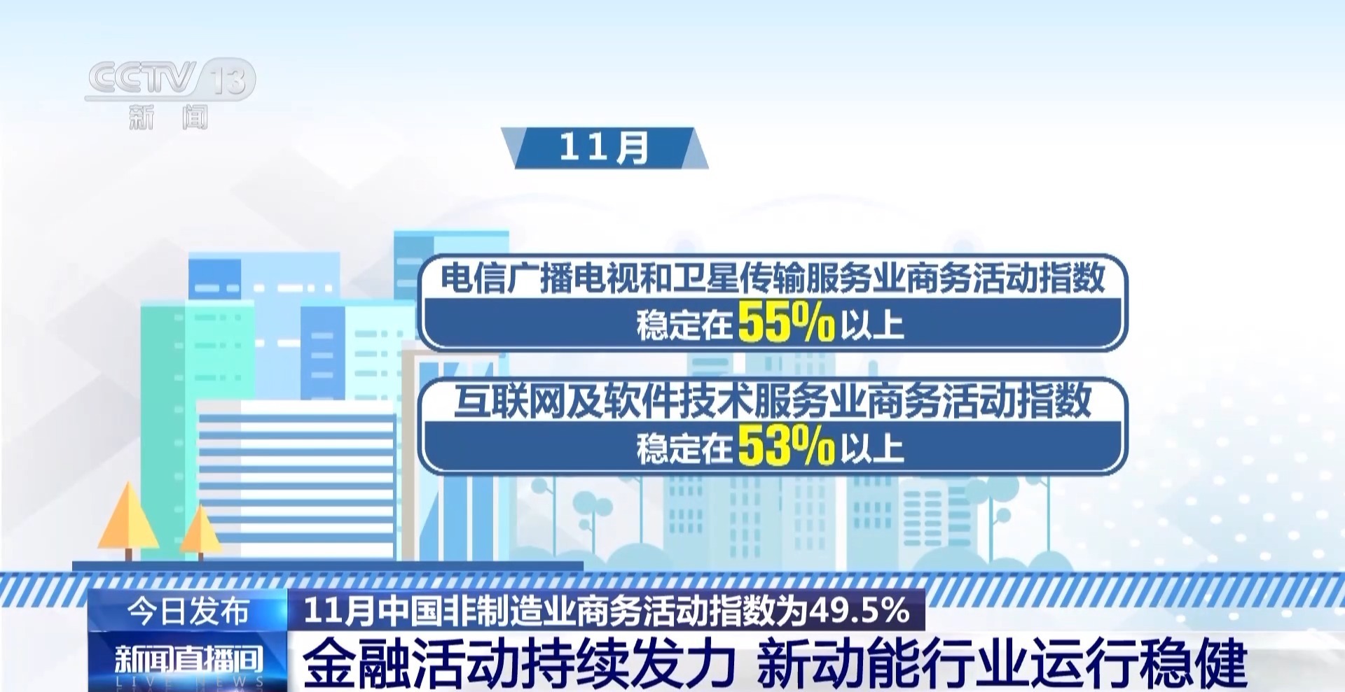 11月份,中国非制造业商务活动指数为49.5%。金融业商务活动指数和新订单指数较上月均有明显上升,且均升至55%以上的较高水平。电信广播电视和卫星传输服务业商务活动指数稳定在55%以上;互联网及软件技术服务业商务活动指数稳定在53%以上。